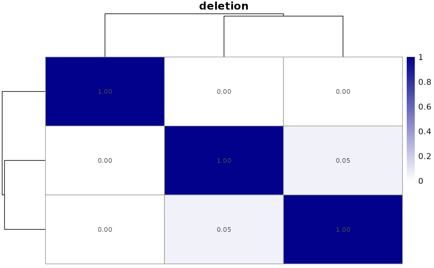show_colnames=FALSE, main="deletion", display_numbers=TRUE,